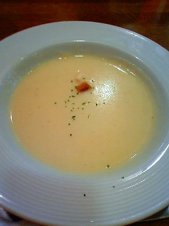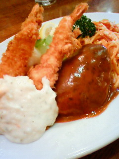 私がオーダーしたのはおなじみランチ(かな??記憶がっっ)。でっかいエビフライ(さくさくで美味しいっっ)、ハンバーグ(柔らかくて肉汁バネェ!)、ナポリタン(量、ごっついです)、付け合わせのポテトサラダに生野菜。