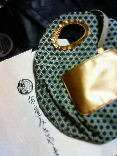 するがや祇園下里(前のブログ、店名間違えてた)、都路里、祇園小石、そして雑誌に載ってた布屋みさやまの手ぬぐいバッグ!ここのオリエンタルバッグがすんごく気に入ってて、小物もどれも素敵!(tententenってお店もオススメ)今回新商品なのか、見たことのないバッグだったから慌てて店長さんに写メ。そしたらお店に行ってくれて「どっちがいい?」と、緑×銀と青×金のバッグの写メが。悩んだけど、アスカガ(アスラン青、カガリ金)っつーことで青×金にしてもらいました(o^∀^o)プレゼント用の包装も着物収納してるみたいにしてくれて感動っっ。大切に使いますっっ。