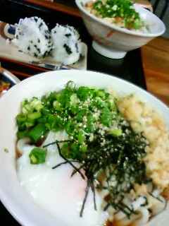 今回もぶっかけ温泉卵うどん。お腹すいてたんで、ちくわの天ぷらにうずらの串もお会計。もちろんうどんには大量の刻み葱と天カス投入!